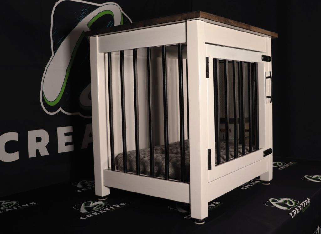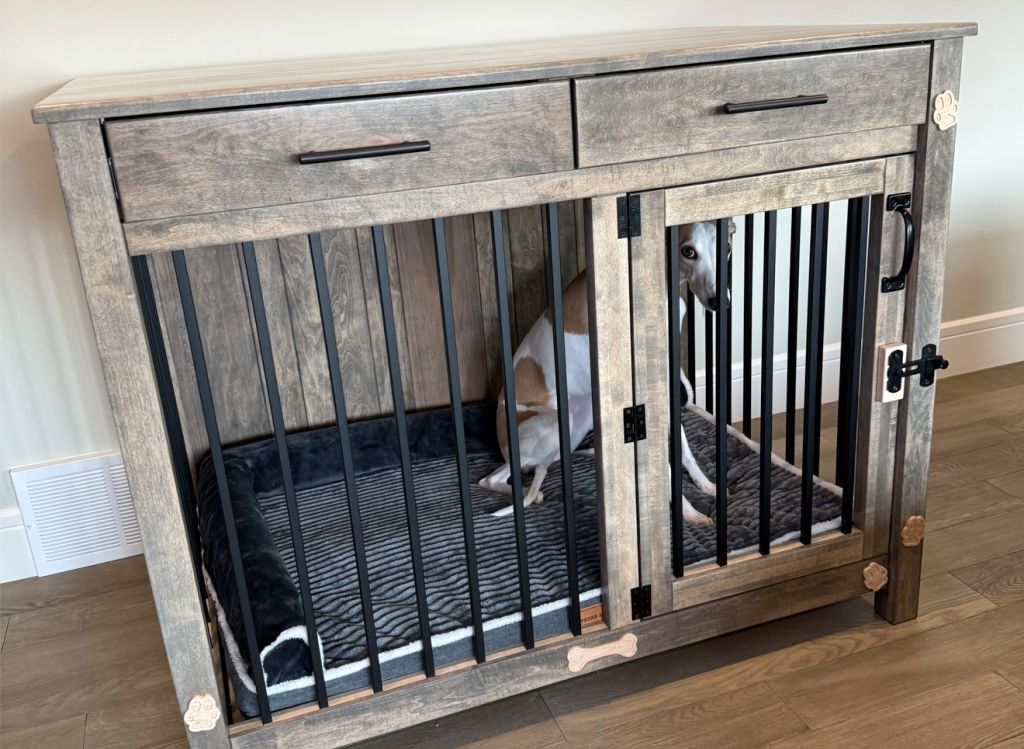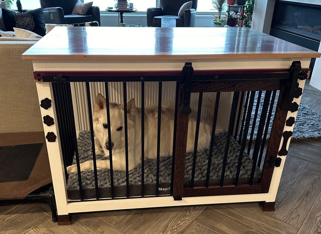 Our flagship custom dog crates are built like no other, crafted from kiln-dried hardwoods, finished with 10 coats of protective clear, and topped with striking options like purpleheart, wenge, padauk, or lacewood. Each crate features durable LVT flooring, elegant barn door options, and comes complete with an orthopedic mattress with washable cooling and warming covers.