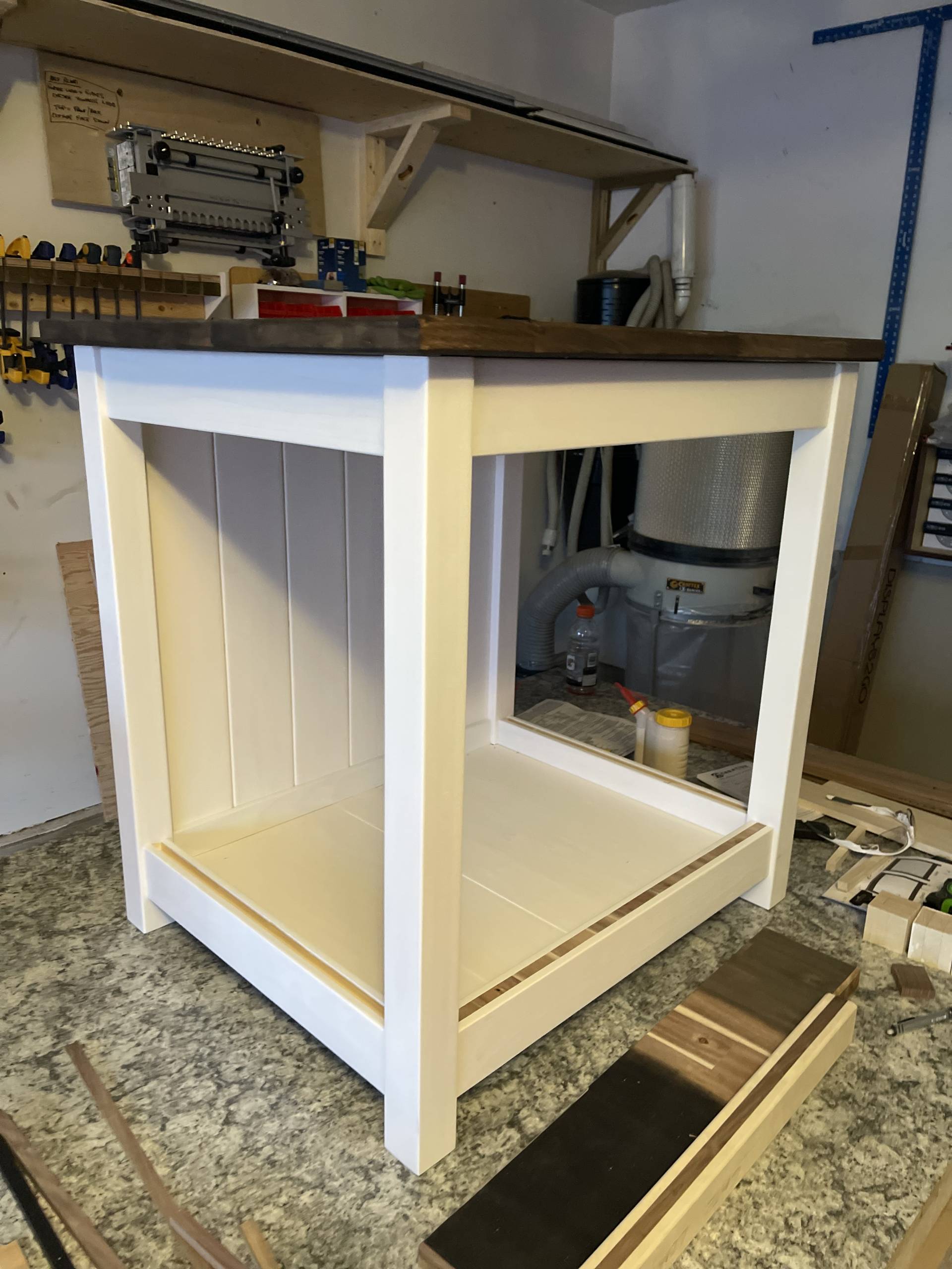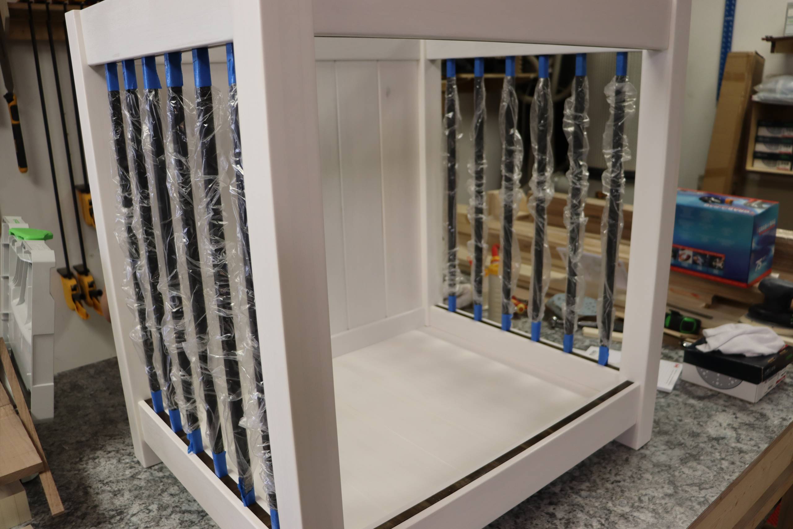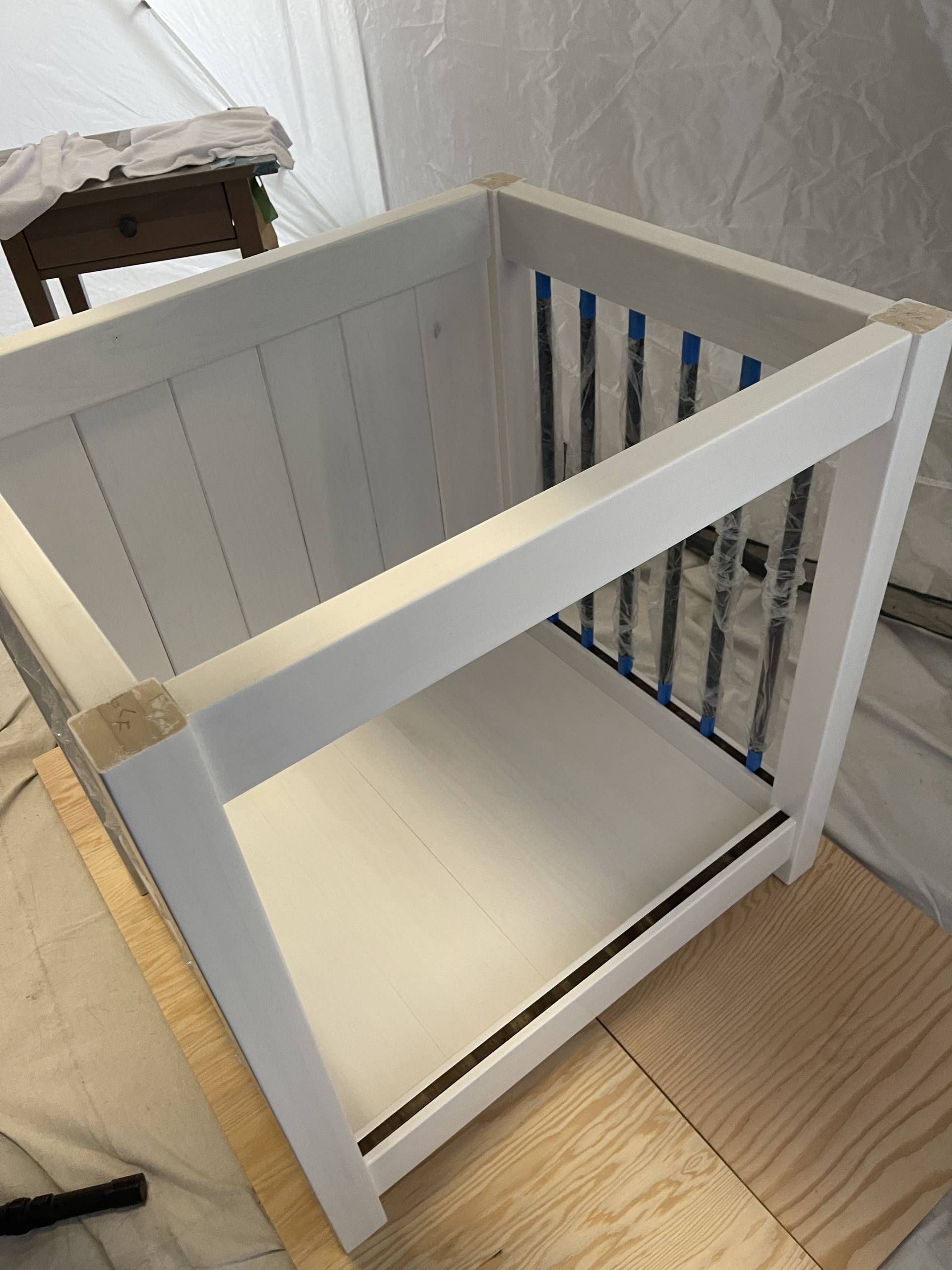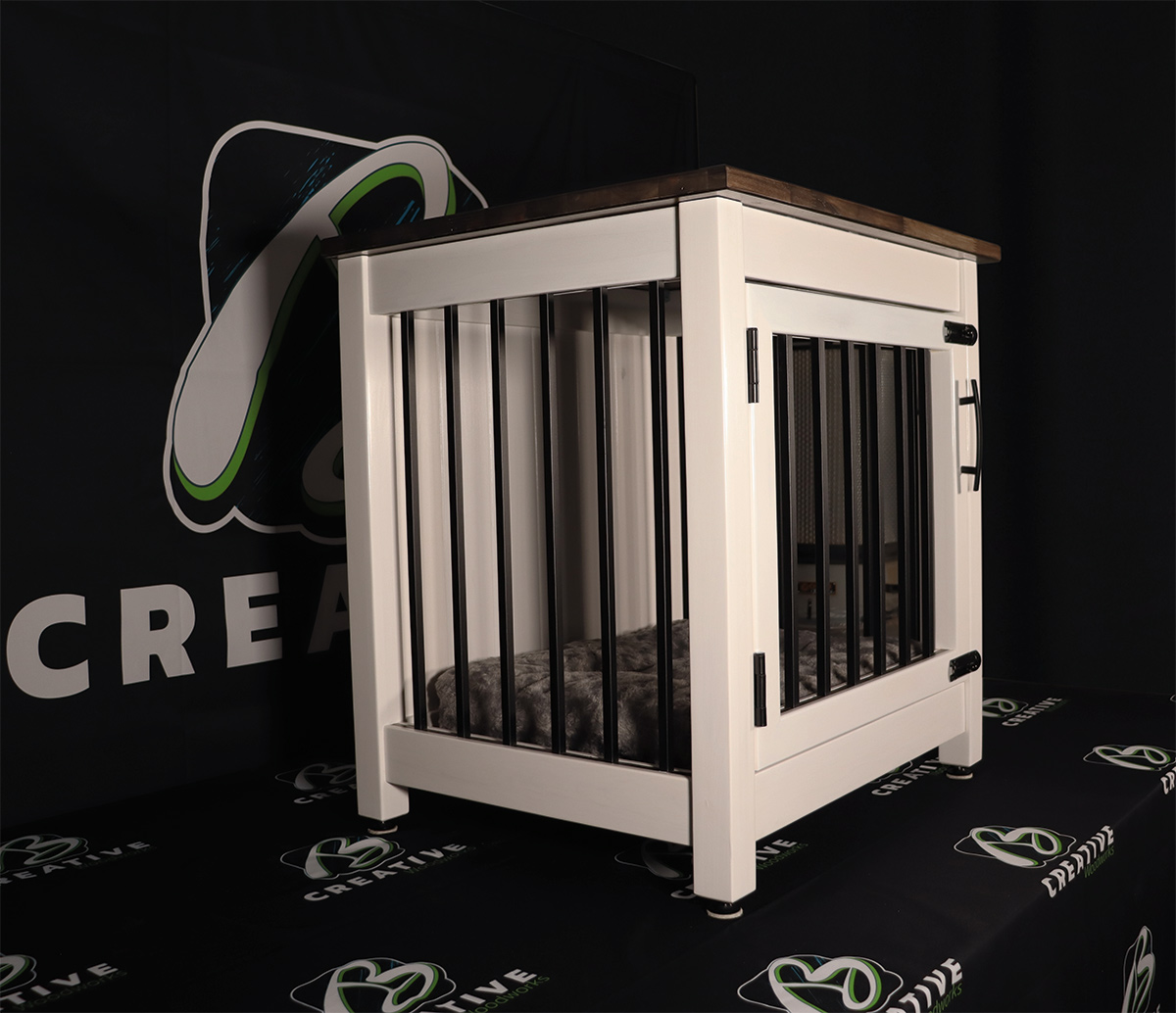 Our customer was looking for a crate to provide some enclosure for her pup, as well match her existing home décor. We went to work on matching stain colors to her kitchen table and the whitewash color on her furniture. We took the details to the max with Acacia inlays and Acacia butch block top. The floor was sealed using premium vinyl plank flooring to make clean up simple and protect the crate foundation.