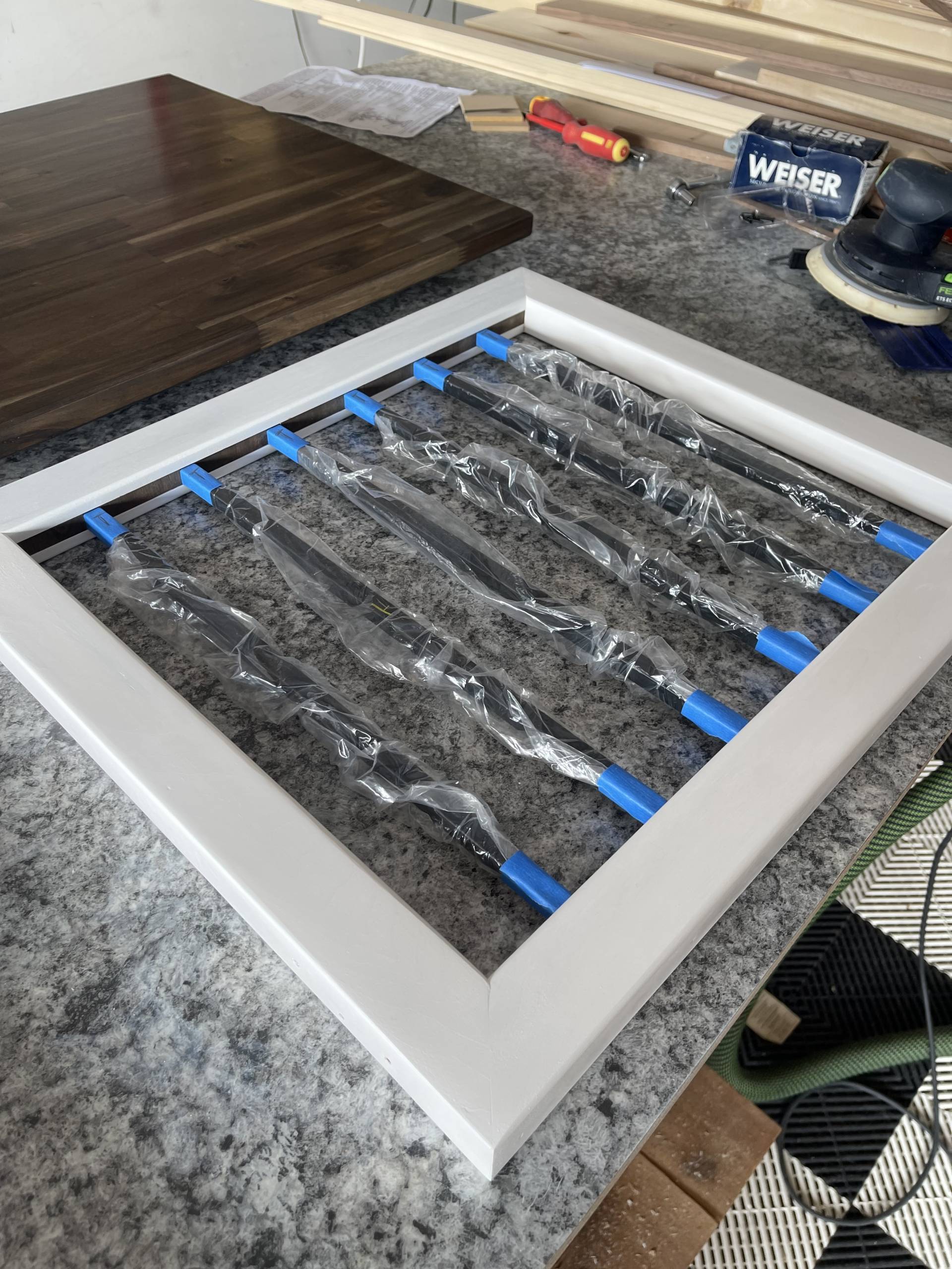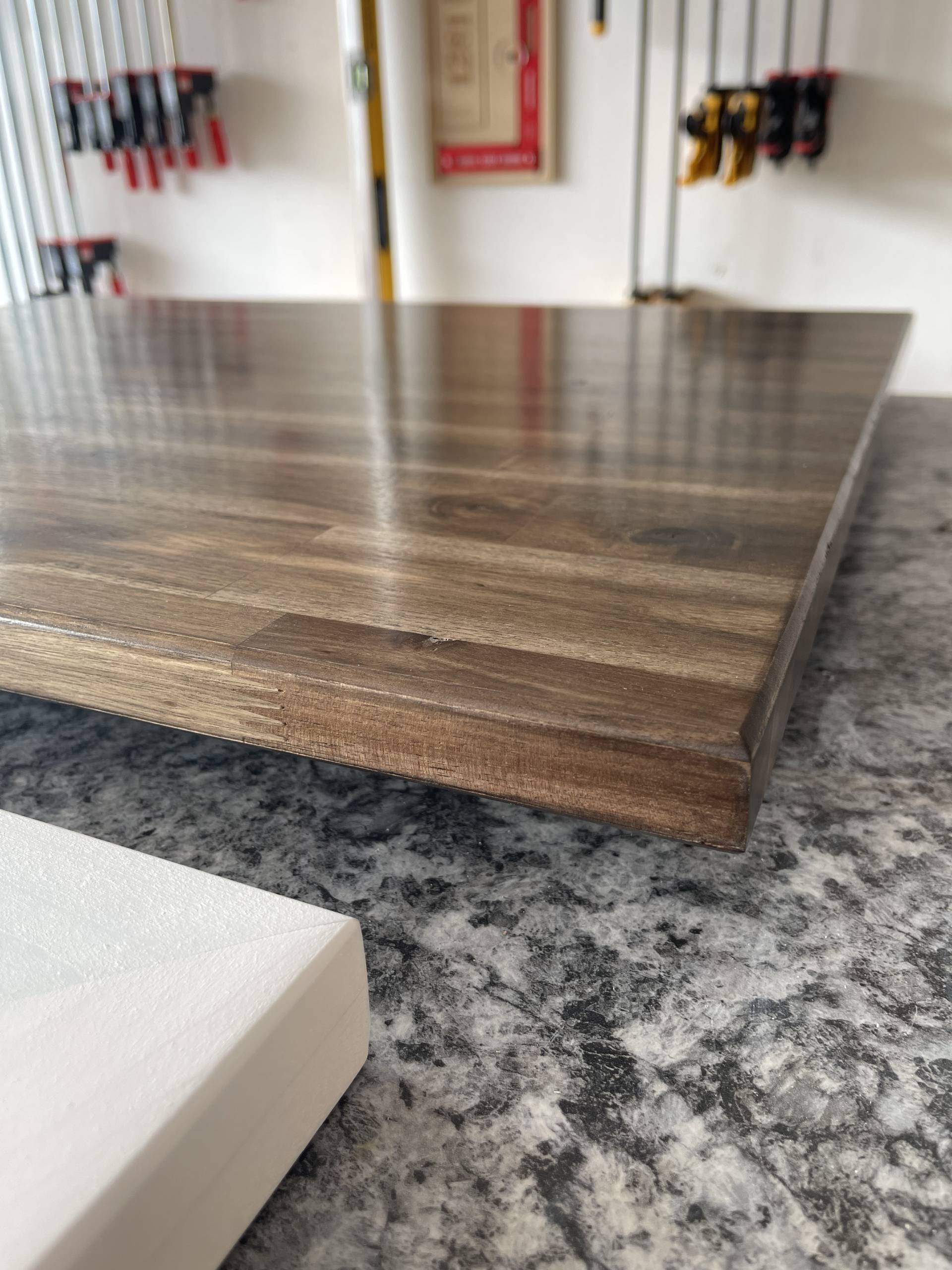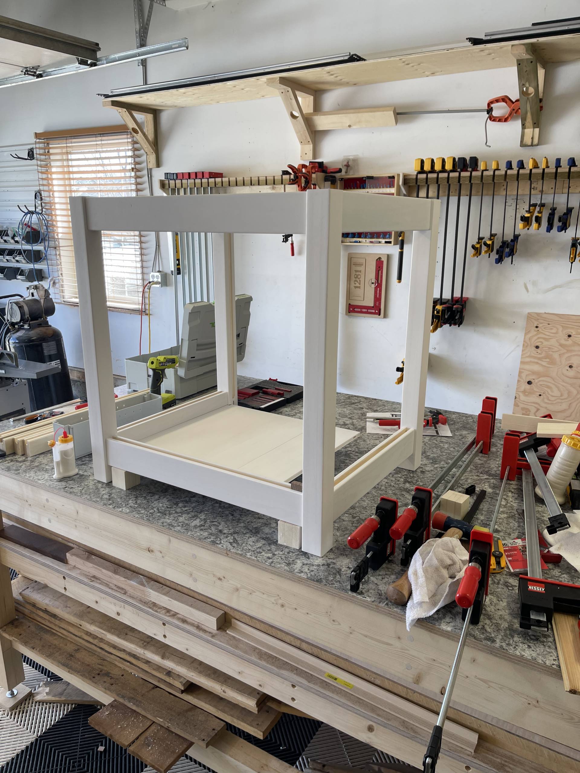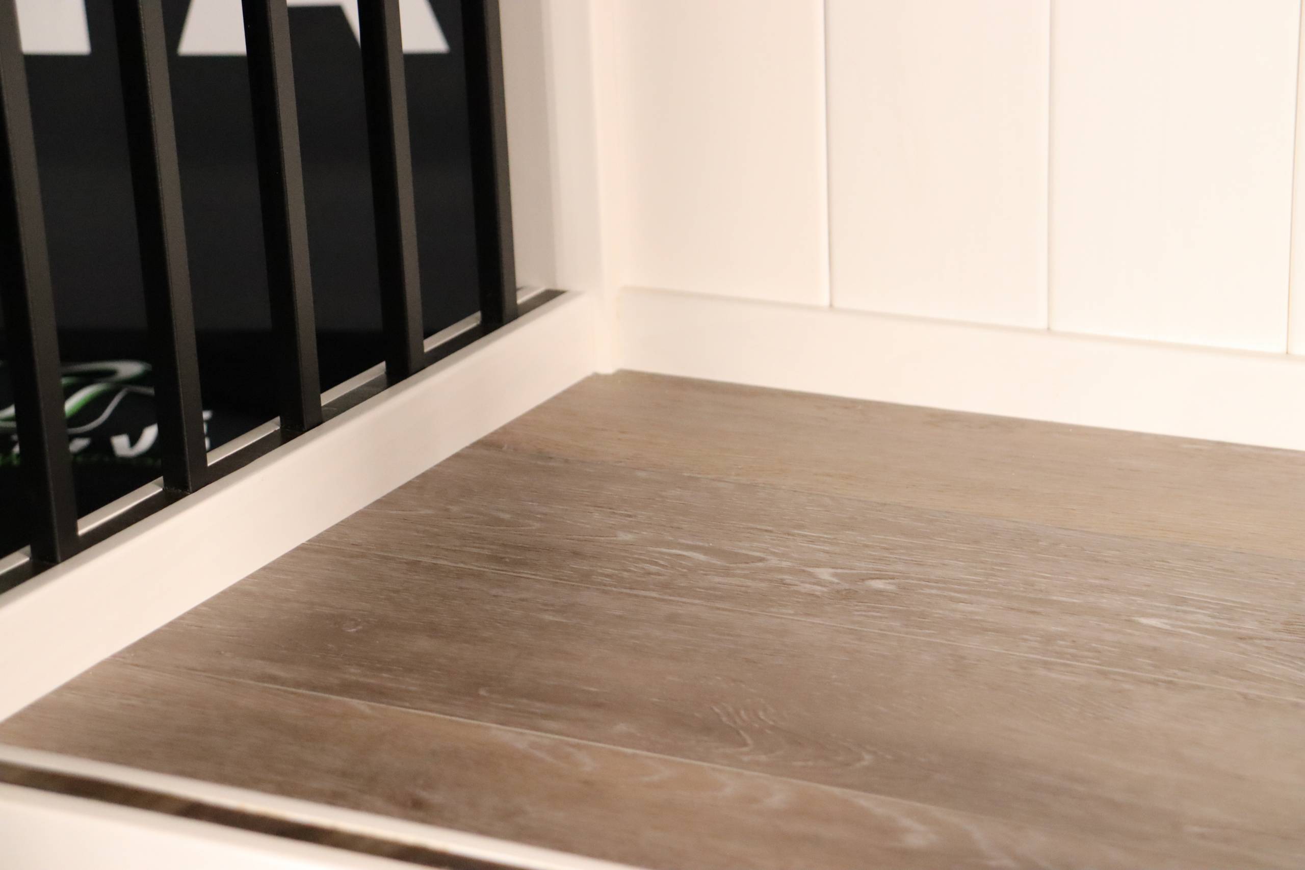 Our customer was looking for a crate to provide some enclosure for her pup, as well match her existing home décor. We went to work on matching stain colors to her kitchen table and the whitewash color on her furniture. We took the details to the max with Acacia inlays and Acacia butch block top. The floor was sealed using premium vinyl plank flooring to make clean up simple and protect the crate foundation.